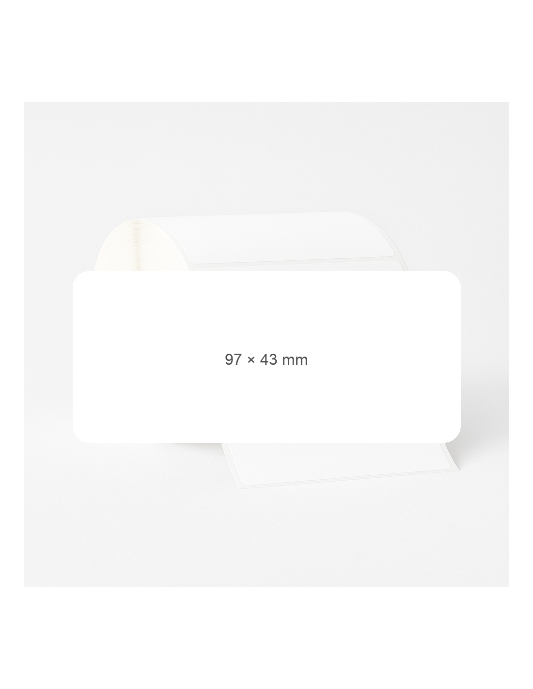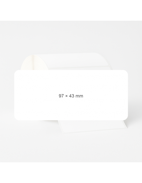 Adhesive labels. Width:97 mm, Height:43 mm. Material: Thermo Ecco. Rolls of 1100 pcs. Quantity per box: 17,6 t.