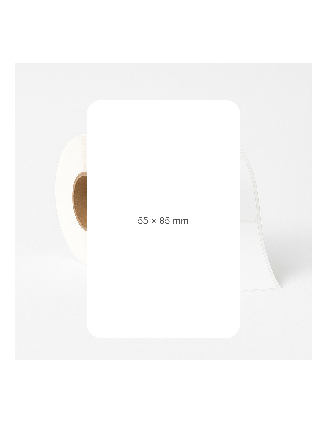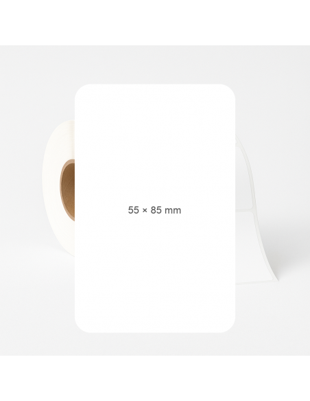 Adhesive labels. Width:55 mm, Height:85 mm. Material: Thermo Ecco. 600 rolls per roll. Quantity per box: 19,2 t.